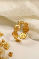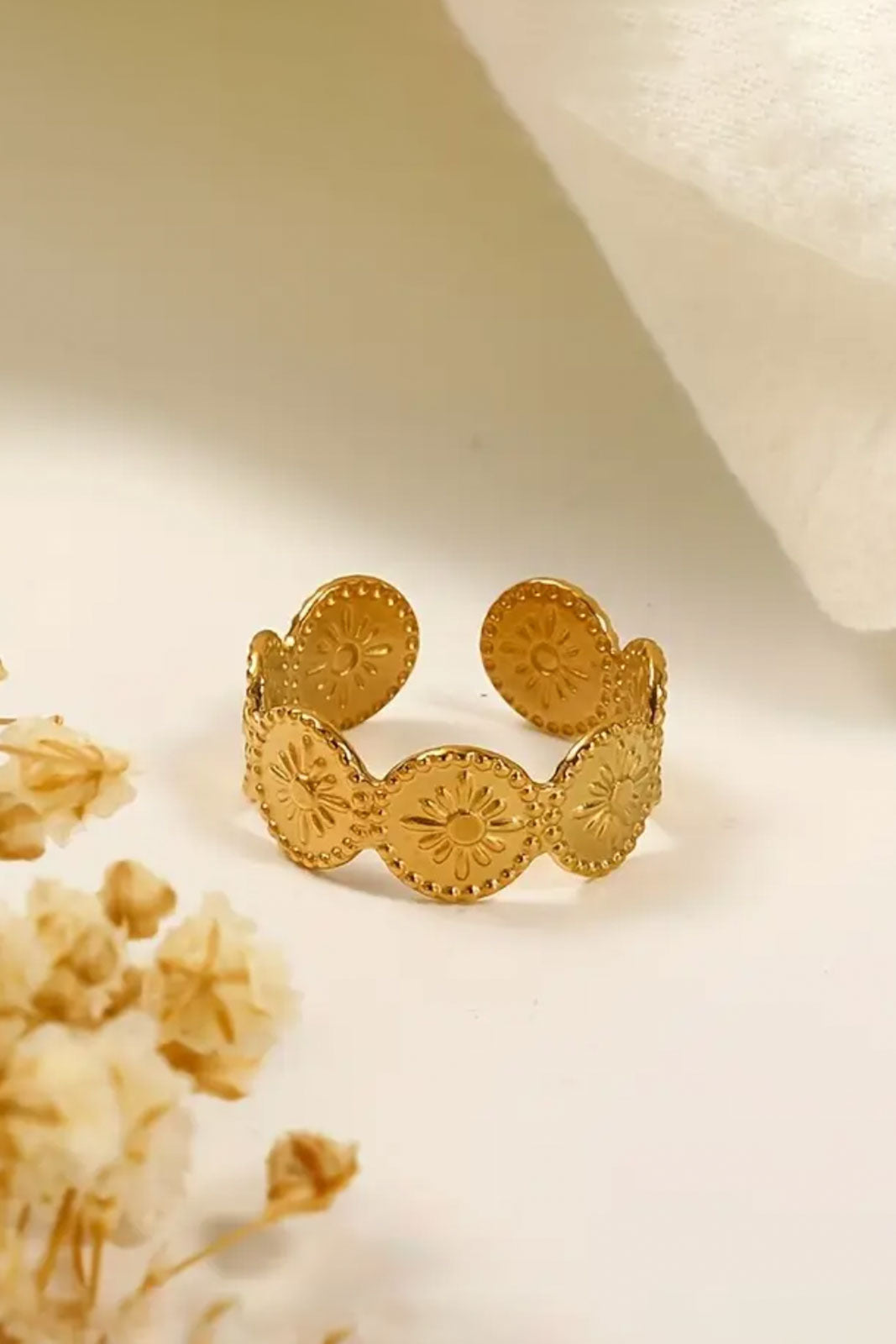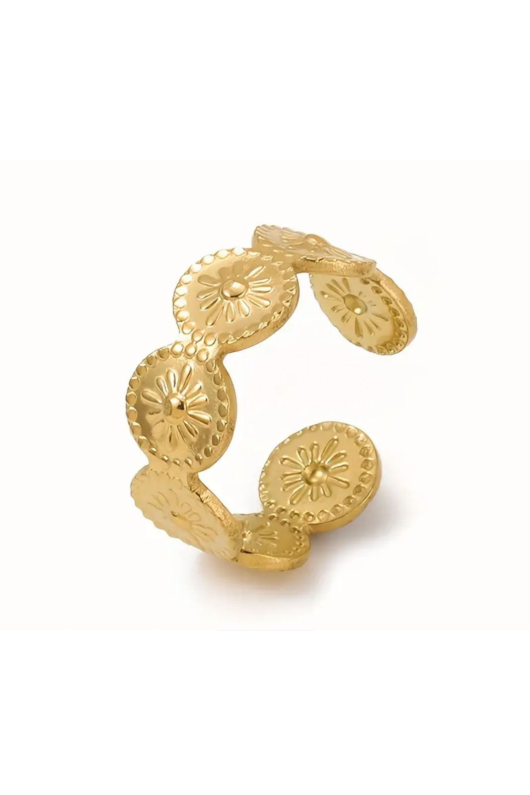 Flower Adjustable Ring — a little piece of golden magic for your hands. Designed with softly embossed flower details, this ring brings a vintage feel with a modern, effortless edge. Crafted from stainless steel with an 18K gold-plated finish, it’s made to shine with you, day and night.