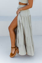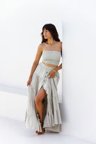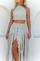 From morning beach strolls to hot dates, our flattering Flora Maxi Skirt has you feeling confident and carefree. This pretty staple features beautiful coconut buttons down the front that can be unbuttoned to show more skin or styled for a flirty, playful touch. Finished with a comfy shirred waistband, this soft and breathable beauty is made for your summer of love.