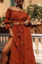 The Esmeralda Crop Top is a soft, feminine dream, designed to take you from day to night. This beauty works on or off-the-shoulder. Featuring a shirred waistband, puff sleeves, elastic frill neckline and detailed with a keyhole opening and delicate ties. This crop is a perfect match with the Daisy Mini Skirt, Esmeralda Maxi Skirt, Lotus Pants and of course all of the denim you own. Fits true to size.