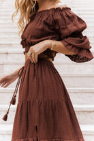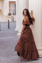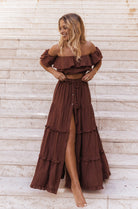 The Esmeralda Maxi Skirt is a flattering staple that effortlessly blends comfort and confidence. Featuring playful side slits and front buttons you can leave closed or unbutton for a more seductive look. Designed with a soft cotton finish, comfy elastic waistband, and tassel tie detail for all-day wear.