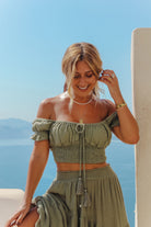 Designed to be worn on or off the shoulder, the Sheba Top adapts effortlessly to your mood and style. Beautiful tie details with tassels and beads add a playful touch, making it a standout in any outfit. Dress it up or keep it casual—this top is your new go-to for effortless elegance.