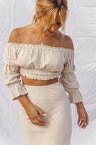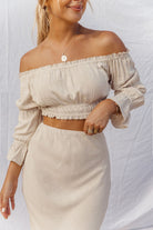Introducing our stunning new Bella Top in Beige Linen Blend, designed to elevate your wardrobe with effortless elegance. Crafted from a luxurious linen blend, this off-the-shoulder top features two comfortable and beautifully detailed elastic waistbands that ensure a perfect fit and flattering silhouette. Complete with charming puff sleeves, this top effortlessly combines comfort and style, making it the perfect choice for any occasion.
