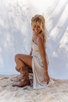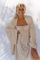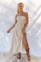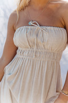 Introducing our Miracle Maxi Dress in Beige, a stunning fusion of comfort and elegance. Crafted from a premium linen blend, this dress boasts a strapless and adjustable top for customizable wear, ensuring a perfect fit for every body type. The beautiful elastic detail at the waist accentuates your silhouette while providing comfort and flexibility throughout the day. With a chic split at one side, this maxi dress offers a touch of allure and movement with every step. Pair it effortlessly with our Desert Kimono for a flawless ensemble that embodies timeless sophistication and modern charm. Elevate your wardrobe with the Miracle Maxi Dress – where style meets comfort in perfect harmony.